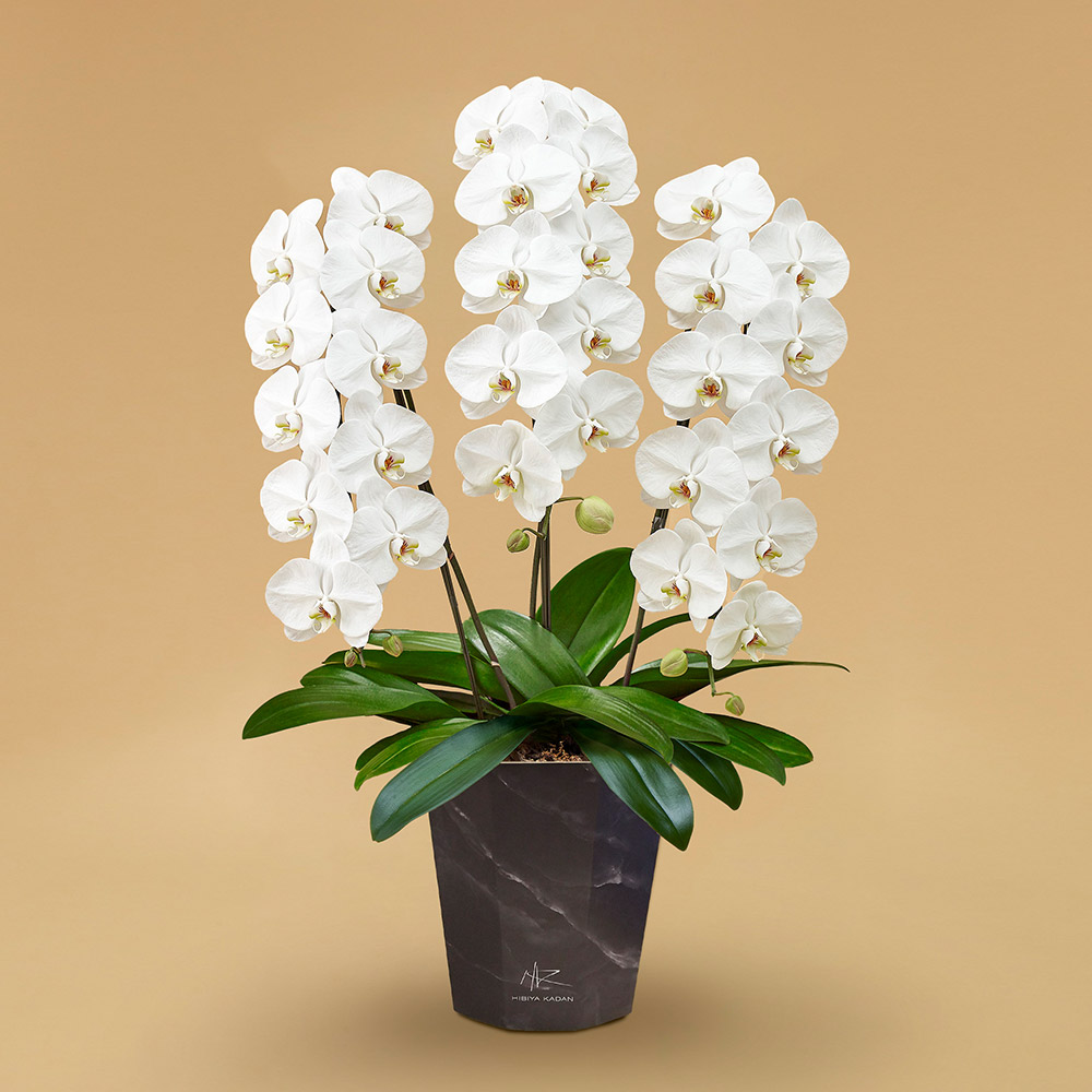 日比谷花壇のバイヤーが自信をもってお勧めする高品質な胡蝶蘭をエポットに植えてお届けします。エポットとは、陶器鉢に変わる資源として再利用可能な、 環境に配慮した日比谷花壇オリジナルの紙製鉢です。大輪の純白な花姿は、華やぎと上品で凛とした佇まいで、お祝いごとや、お誕生日などのご用途に最適です。オリジナルエポット鉢(紙製)。
