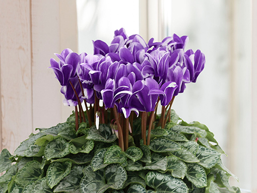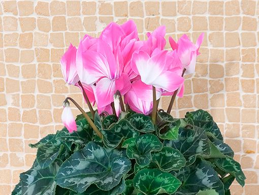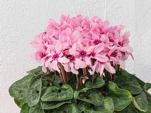 次々と上向きに花が咲き、株を覆いつくすほど豪華に花が咲き誇る幻想的なシクラメン。柔らかいピンク色が、見る人の心を安らげてくれます。