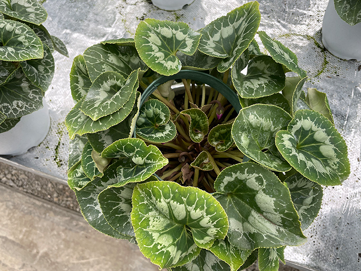 葉一枚一枚を丁寧に整え、株の中心に光が届くようリングを入れることで、葉が増え、花芽も充実します。 葉の数と花芽の数は比例すると言われ、手間を惜しまない葉組みによって花の美しさが決まるのです。 気候や品種によって求められる管理は異なり、同じ年は一度としてないので、その都度、試行錯誤を繰り返しながら積み重ねられた手仕事こそが、根本園芸のシクラメンの確かな品質を支えているのですね。