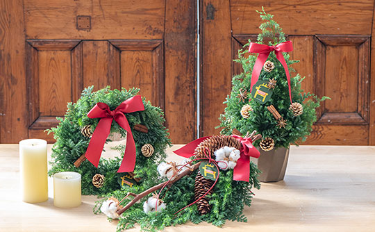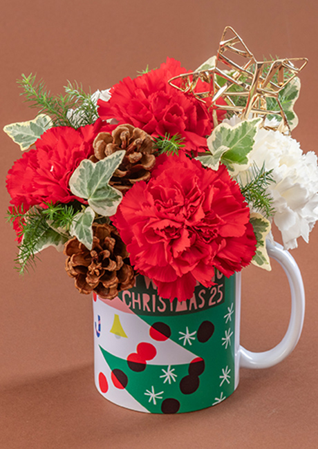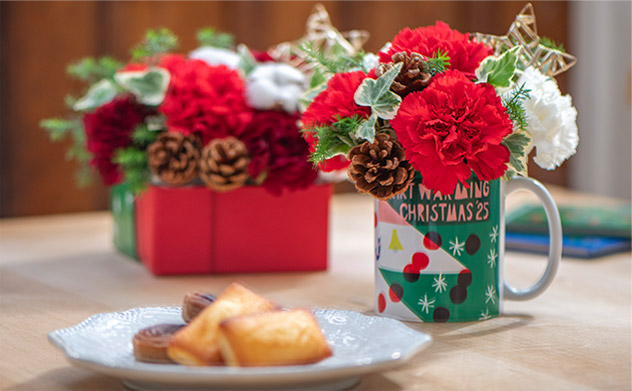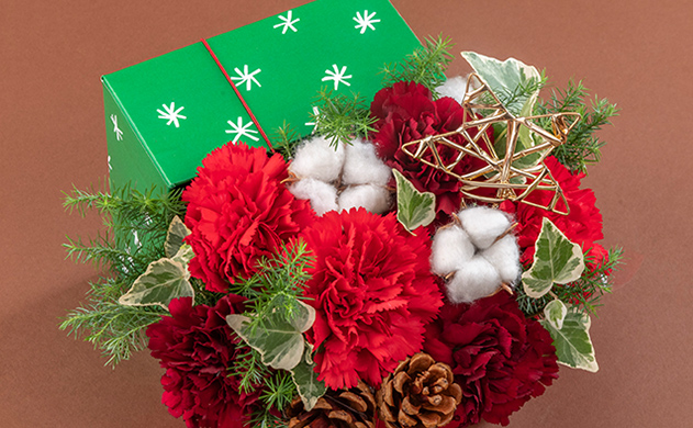 あたたかみのあるコットンや、愛らしい赤いカーネーション、季節感たっぷりの松かさを添えて。大切な人に、心ときめくホリデーシーズンをお届けします。