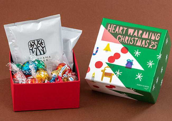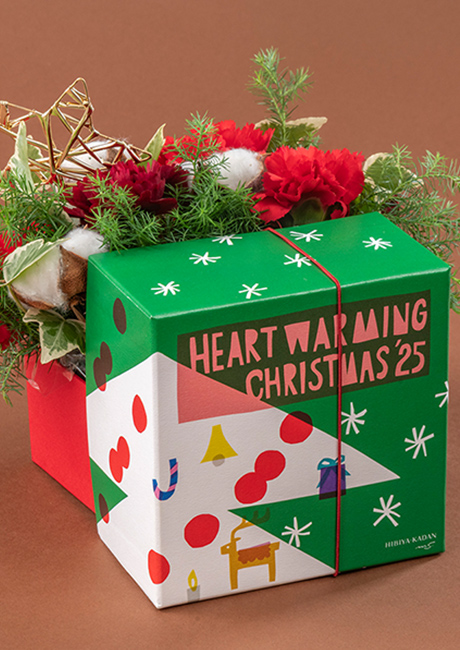 2025年のテーマ「Heart Warming Christmas」のロゴが入ったオリジナルボックスには、赤と緑のクリスマスカラーを基調とした花々が詰まっています。