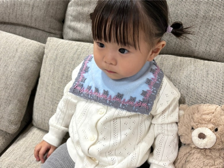 箱から出してそのまま飾れる、華やかな生花(スプレーバラ、カーネーション、スターチス)のブーケ。水やりなどの手間がかからず、忙しいママとパパにも喜ばれる優しいブーケです。そして、繊細なデザインが人気の近沢レース店から、愛らしい猫のロシアンブルーのモチーフ「ベビースタイ」を添えました。人気のシーズンタオルハンカチのレースを使用した、「ベビースタイ」タオル地は、タオルハンカチ同様に今治製です。縫製も日本で丁寧に仕上げています。タオルハンカチと同じくベビースタイも洗濯機でお洗濯可能(ネット使用)。洗濯後のほつれも心配はありません。女の子も、男の子も、みんなの喜ぶ顔が浮かんできそうな、幸せスタイをお届けします。